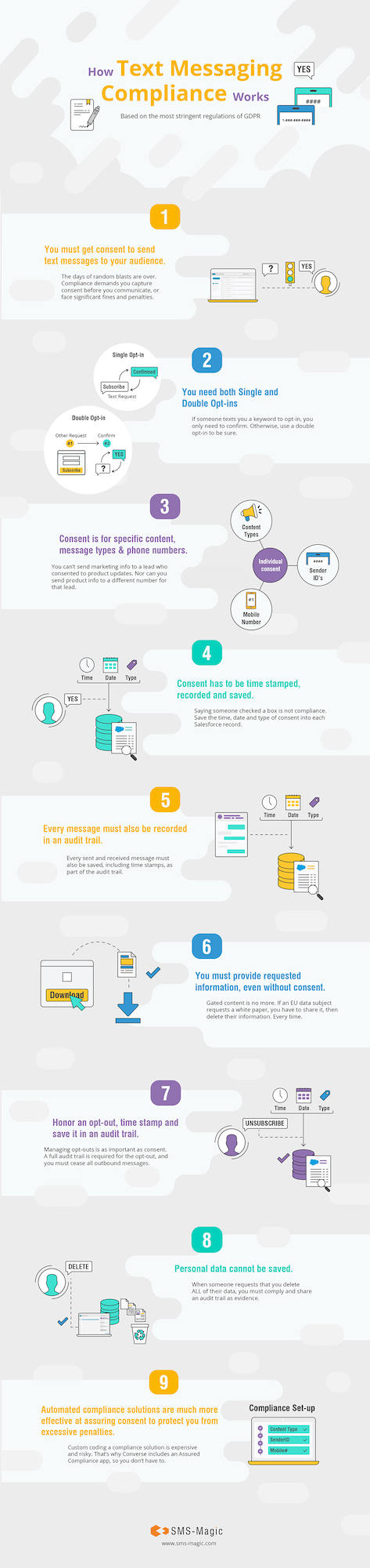 This infographic gives you a quick overview of how compliant text messaging works, based on the most stringent GDPR (and CCPA, the new California Law as of 01/20) regulations.